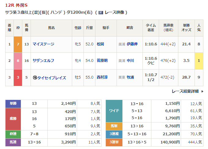 ◎マイステージ(8人気)1着 単勝2,140円、複勝420円