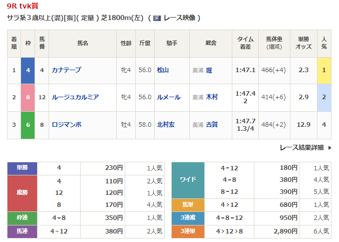 このレースでは◎アイウィルビー(8番人気)1着、◎サミアド(1番人気)2着、★エースアビリティ(3番人気)3着の決着となりました。人気薄の◎アイウィルビーが1着に入ったことで馬連配当は8,010円、3連複は17,230円、3連単は132,480円の高額配当となりました。