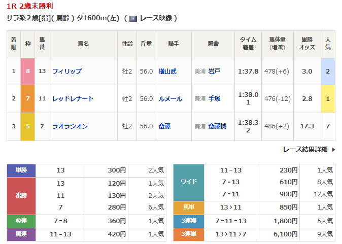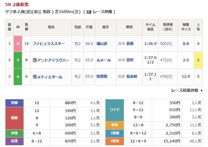 ◎ストラクチャー(6人気)1着 単勝2,350円、複勝310円 - 10/9【京都5R】2歳新馬