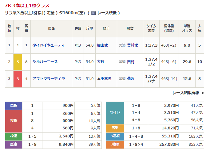 ◎キャプテンネキ(5人気)1着 単勝770円、複勝210円