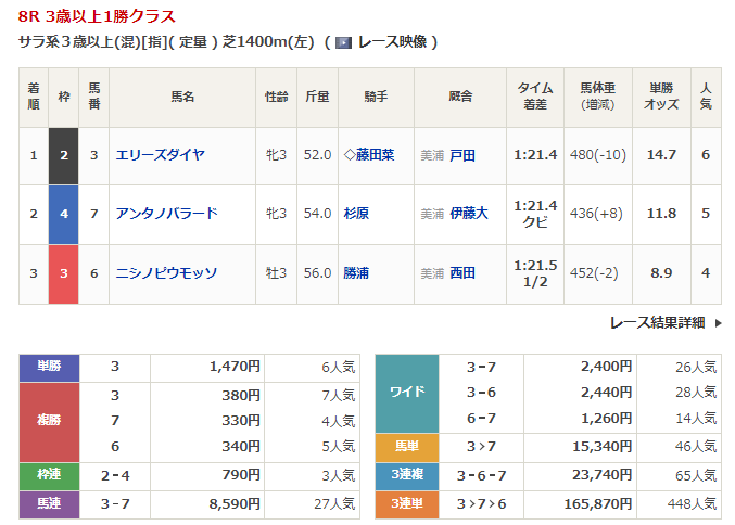 ◎ホワイトクロウ(8人気)2着 複勝240円