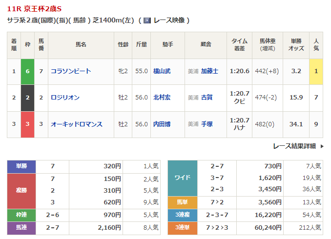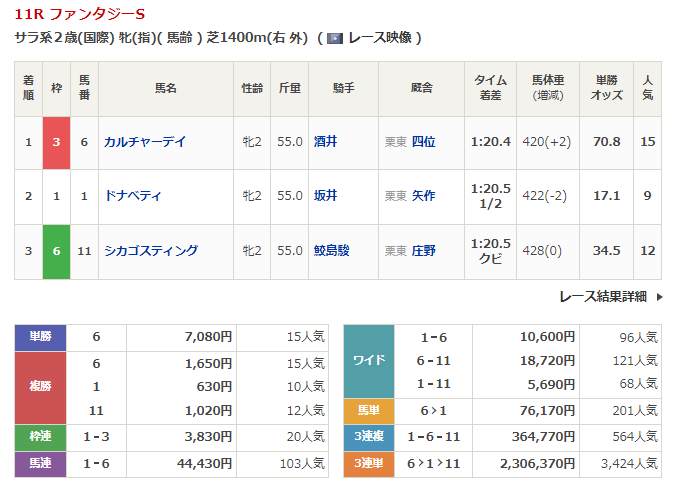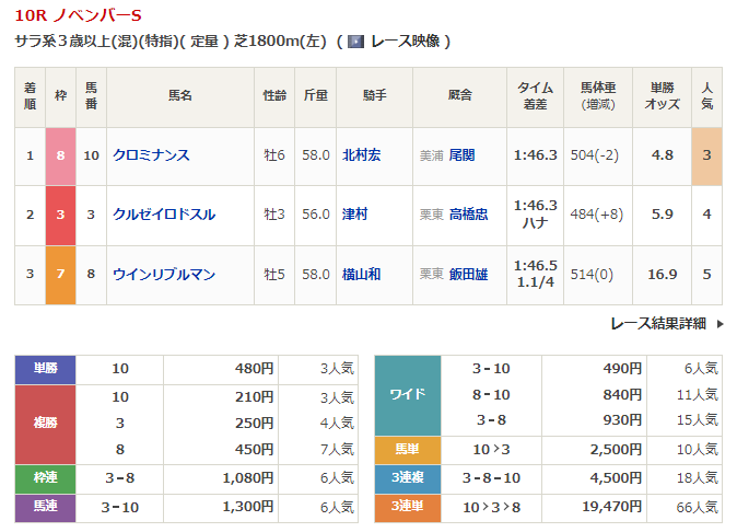 ◎クロミナンス(3人気)1着 単勝480円、複勝210円 - 11/4【東京11R】京王杯2歳ステークス