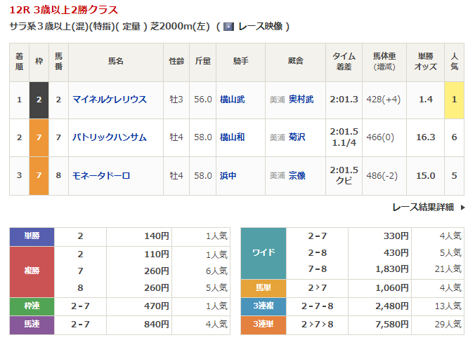 ◎クロミナンス(3人気)1着 単勝480円、複勝210円