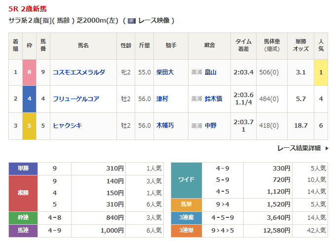 ◎コスモエスメラルダ(1人気)1着 単勝310円、複勝140円