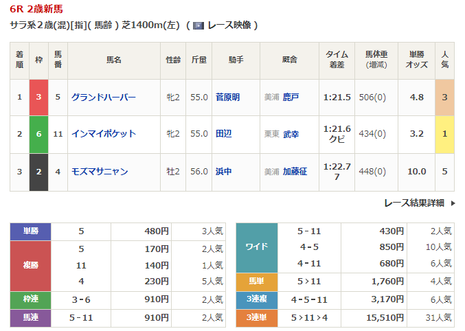 ◎グランドハーバー(3人気)1着 単勝480円、複勝170円