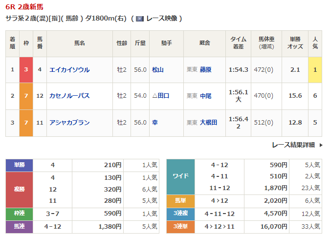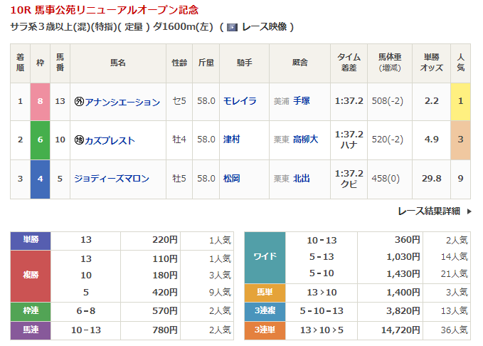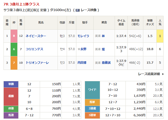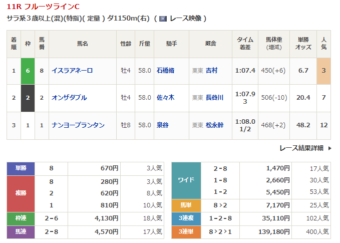 ◎イスラアネーロ(3人気)1着 単勝670円、複勝280円