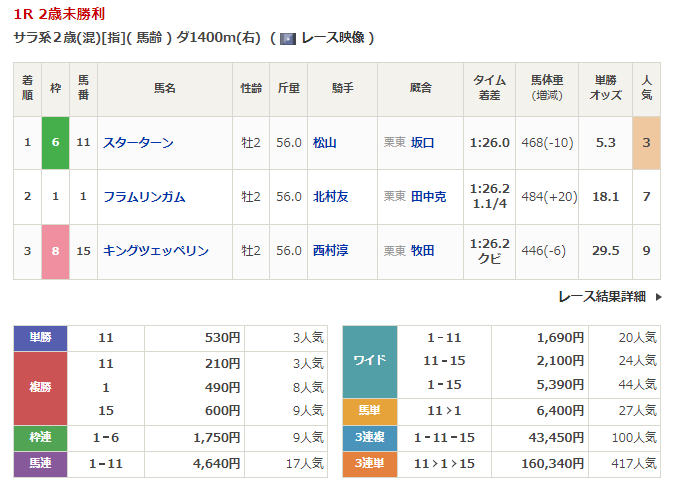 ◎スターターン(3人気)1着 単勝530円、複勝210円