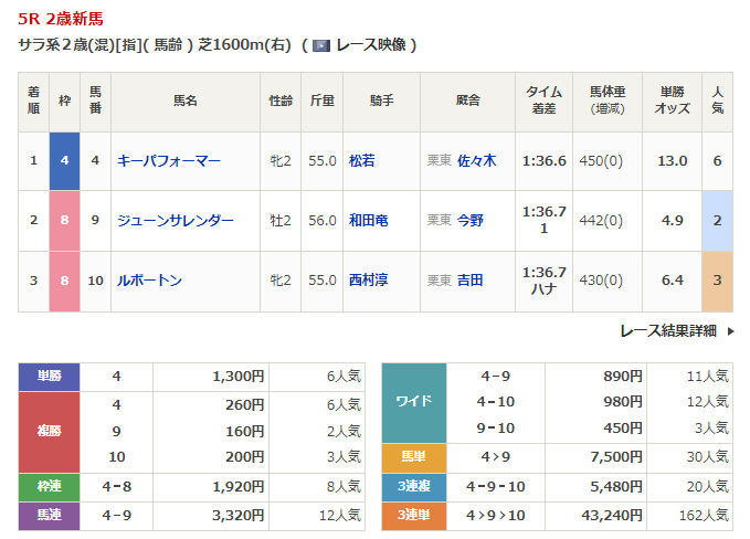 ◎キーパフォーマー(6人気)1着 単勝1,300円、複勝260円