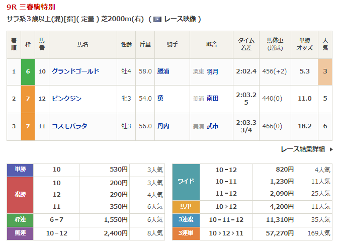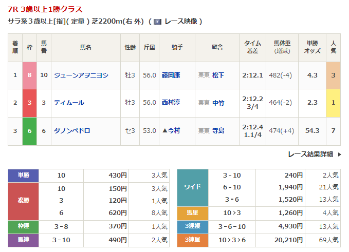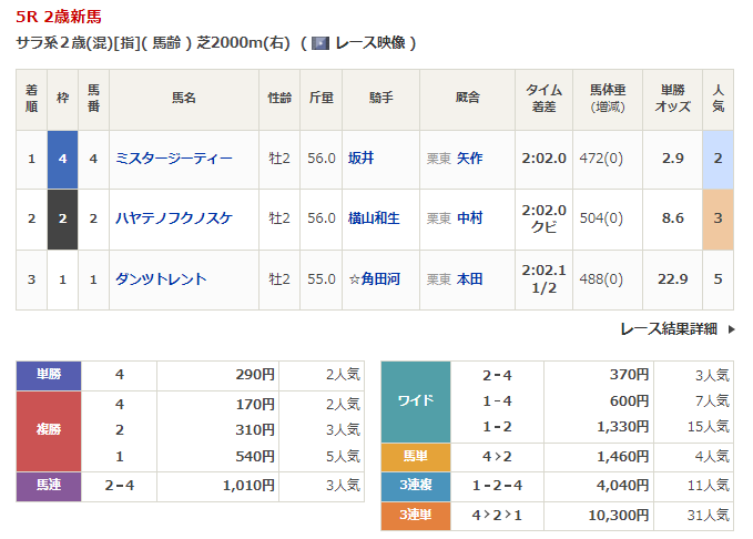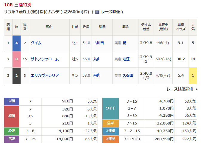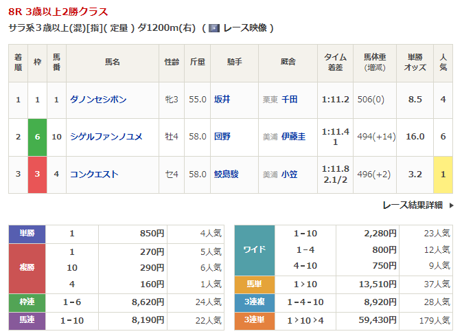 ◎ダイム(5人気)1着 単勝910円、複勝320円
