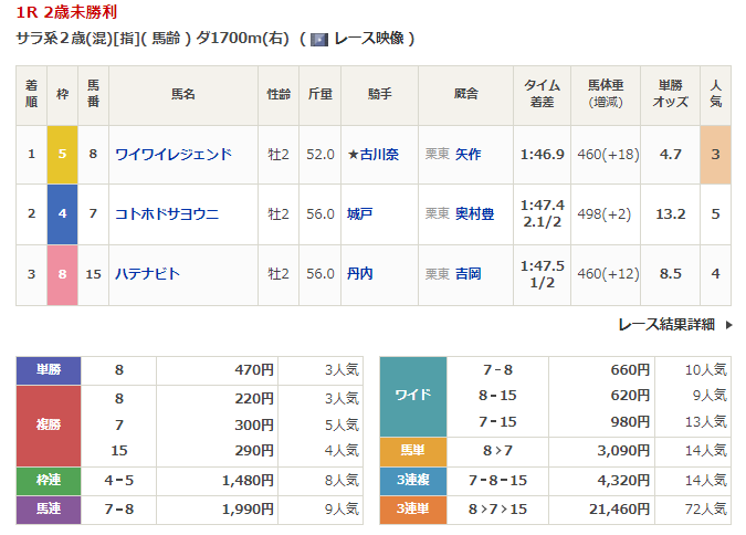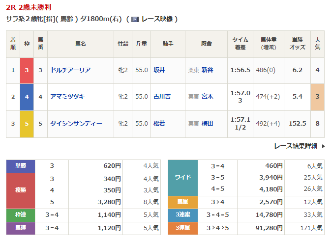 ◎アマミツツキ(3人気)2着 複勝350円 - 11/5【京都5R】2歳新馬