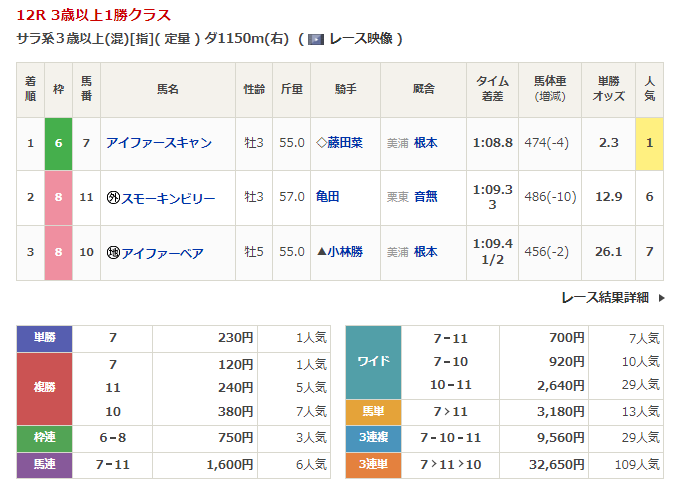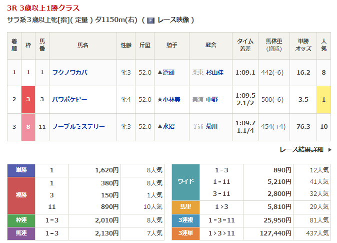 ◎フクノワカバ(8人気)1着 単勝1,620円、複勝380円