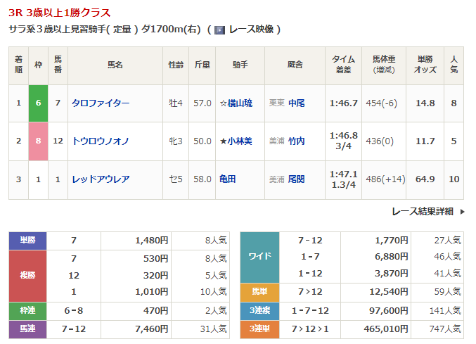 ◎タロファイター(8人気)1着 単勝1,480円、複勝530円