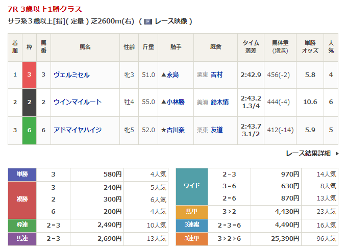 ◎ヴェルミセル(4人気)1着 単勝580円、複勝240円