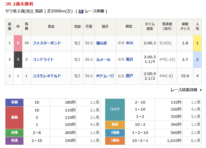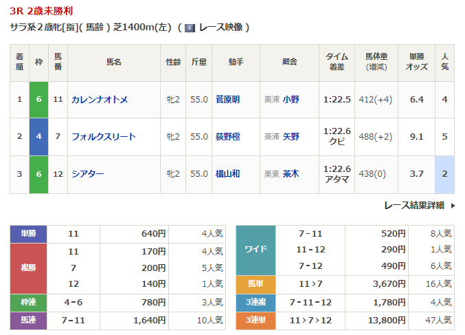 ◎セオ(4人気)1着 単勝710円、複勝190円 - 11/4【福島1R】2歳未勝利