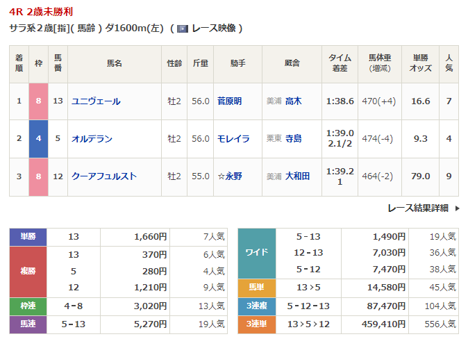 ◎ユニヴェール(7人気)1着 単勝1,660円、複勝370円