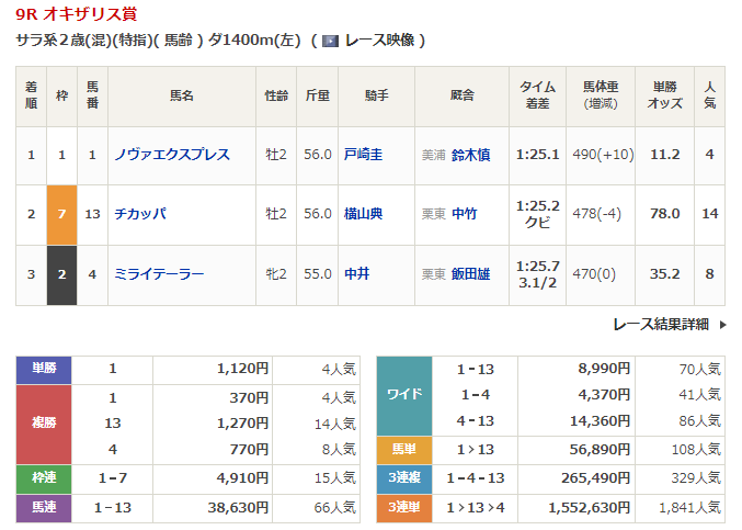 このレースでは◎レオテミス(7番人気)1着、◎スマートプレシャス(2番人気)2着と穴馬同士の決着となりました。相手馬の★サムデイ(3番人気)が3着に入り、3連複は12,980円、3連単は116,880円の高額配当となりました。