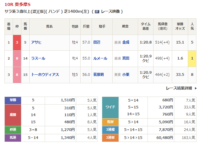 ◎アサヒ(5人気)1着 単勝1,510円、複勝310円