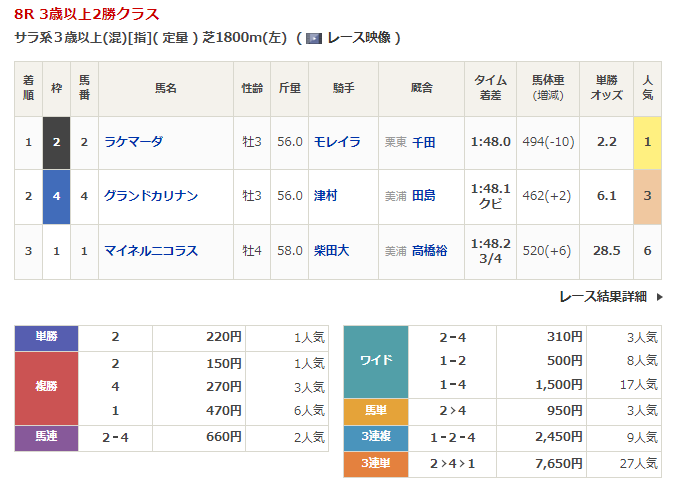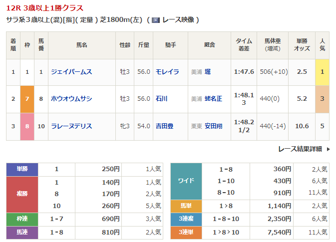 ◎ラレーヌデリス(5人気)3着 複勝260円