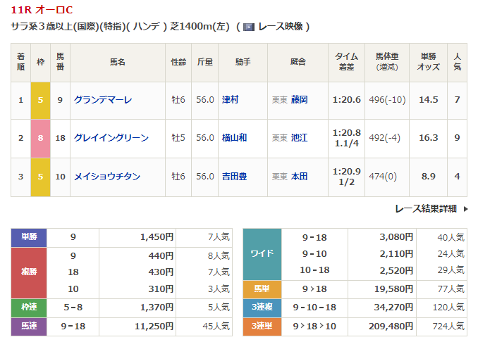 ◎グランデマーレ(7人気)1着 単勝1,450円、複勝440円