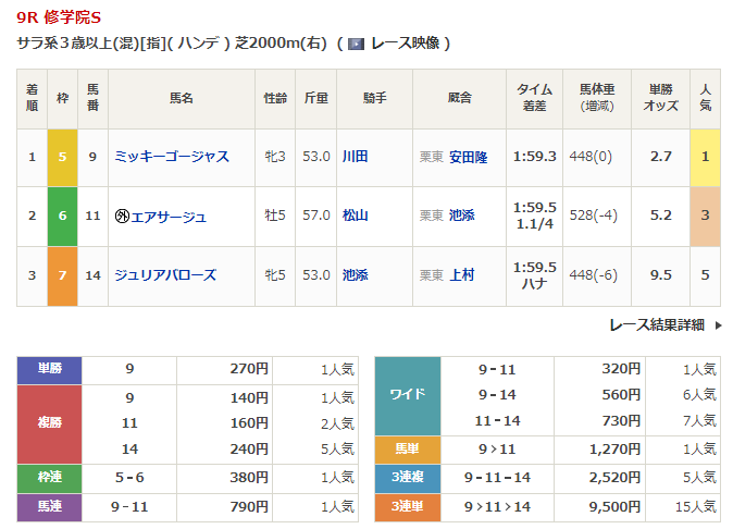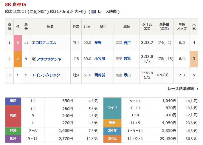 ◎エコロデュエル(4人気)1着 単勝650円、複勝280円 - 11/11【京都9R】修学院ステークス