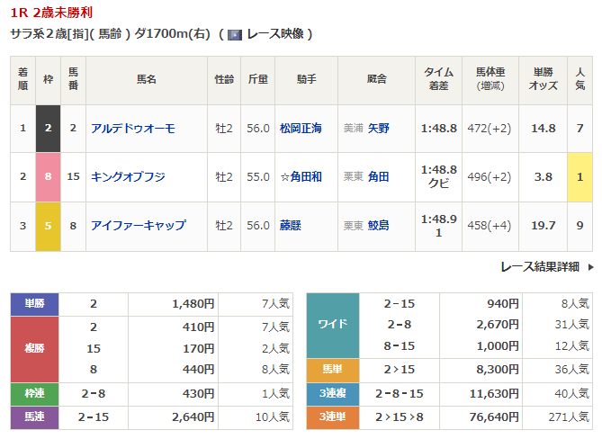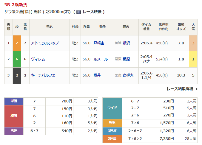 ◎アドミラルシップ(3人気)1着 単勝700円、複勝150円