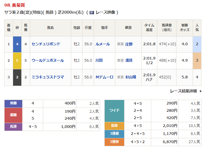 ◎クロミナンス(3人気)1着 単勝480円、複勝210円 - 11/4【東京11R】京王杯2歳ステークス