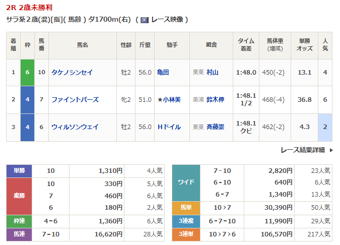 ◎タケノシンセイ(4人気)1着 単勝1,310円、複勝330円