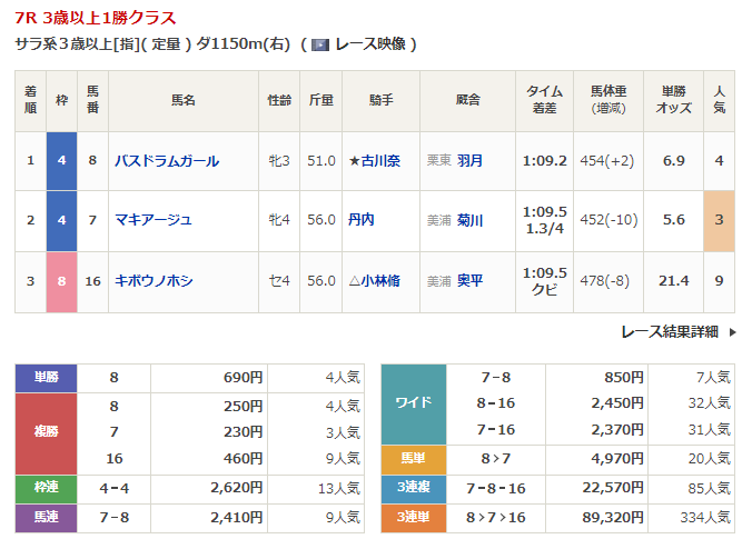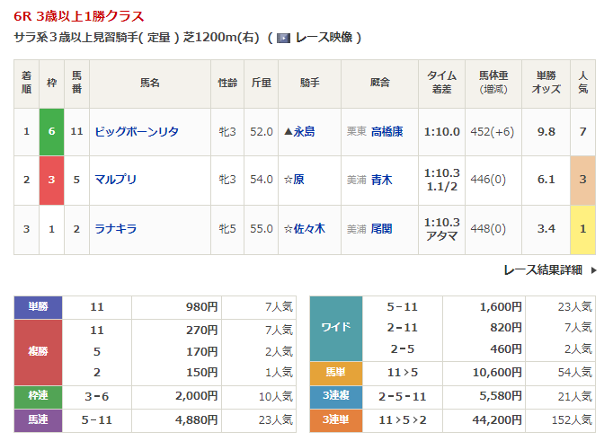 ◎ビッグボーンリタ(7人気)1着 単勝980円、複勝270円
