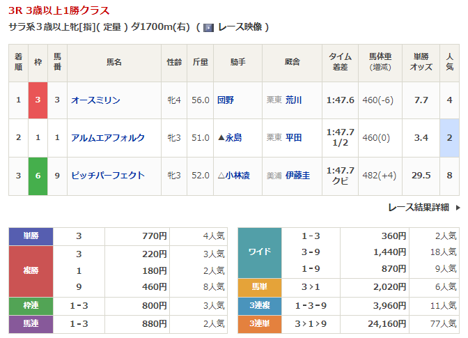 ◎ピッチパーフェクト(8人気)3着 複勝460円