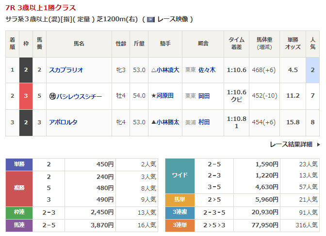 ◎スカプラリオ(2人気)1着 単勝450円、複勝240円