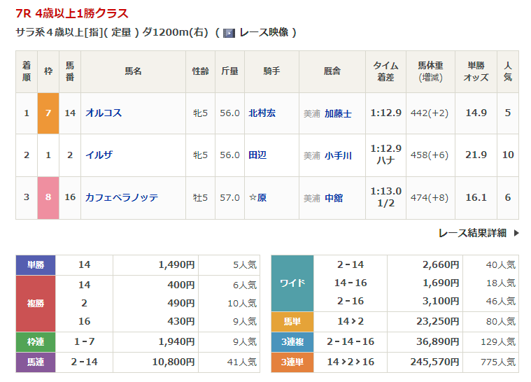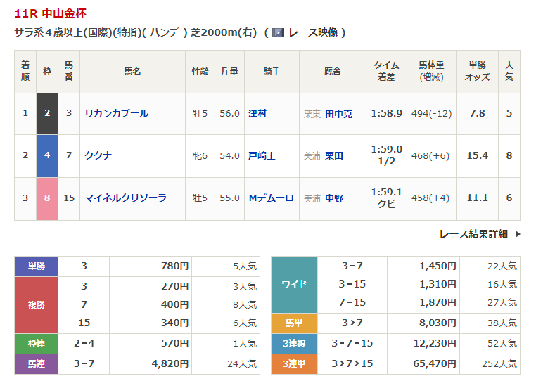◎リカンカブール(5人気)1着 単勝780円、複勝270円