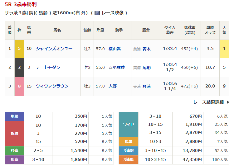 ◎タイキオナード(6人気)3着 複勝400円 - 1/6【中山7R】3歳1勝クラス