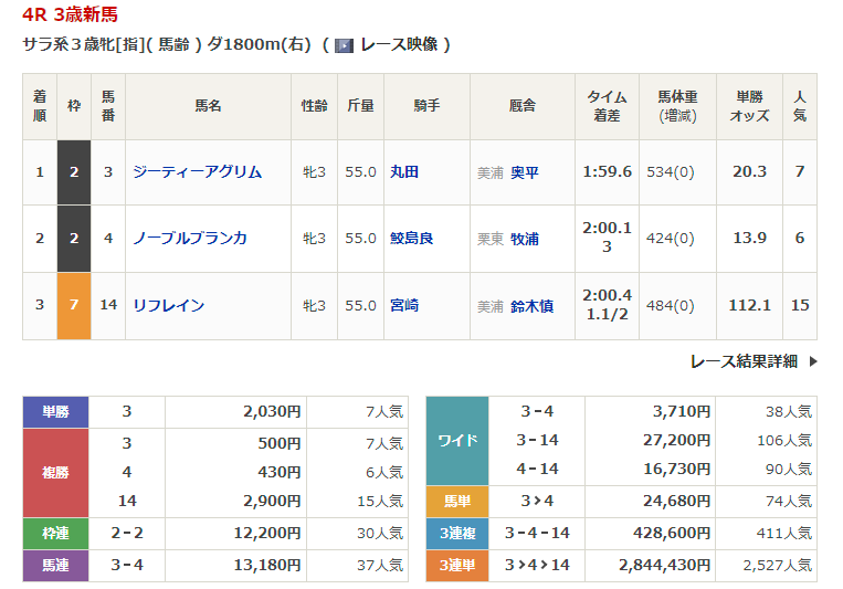 ◎ウインイメル(7人気)1着 単勝4,690円、複勝1,890円