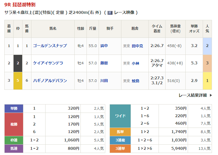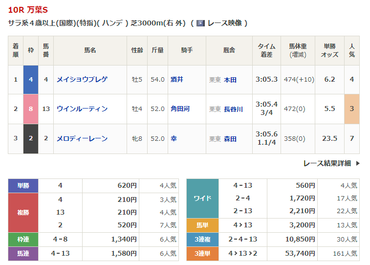 ◎メイショウブレゲ(4人気)1着 単勝620円、複勝210円
