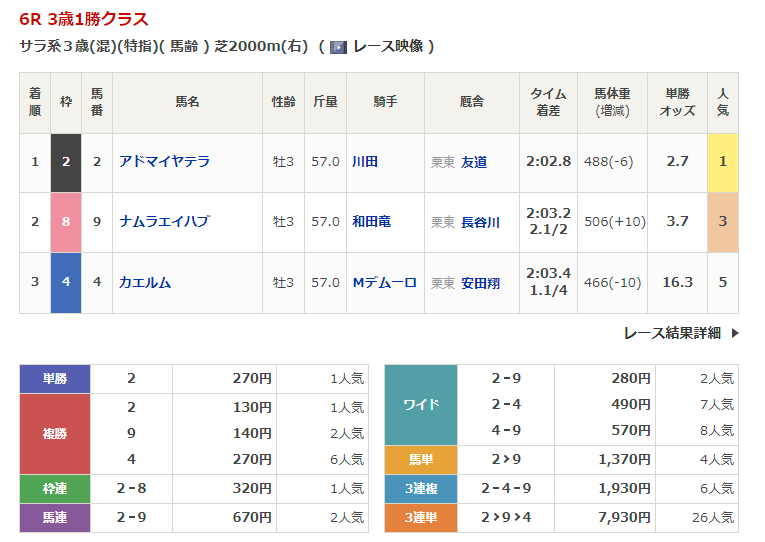 ◎ノーブルブランカ(6人気)2着 複勝430円 - 1/8【中山6R】3歳1勝クラス