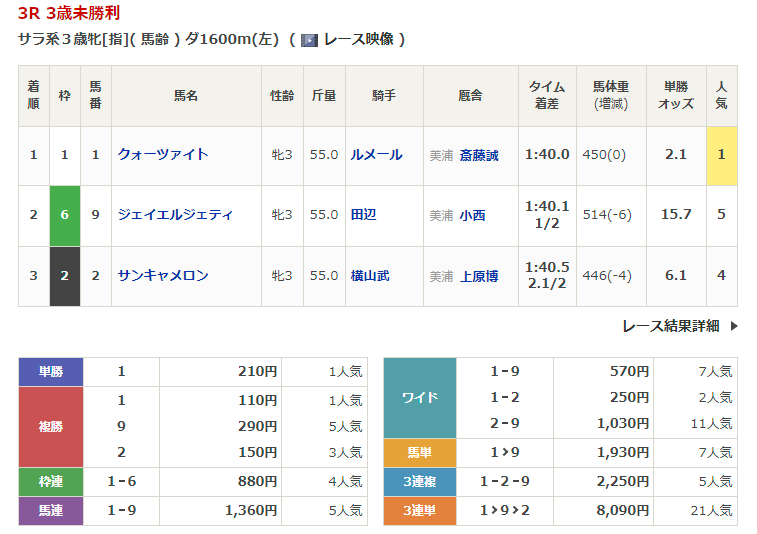 ◎ファイントパーズ(3人気)1着 単勝730円、複勝270円