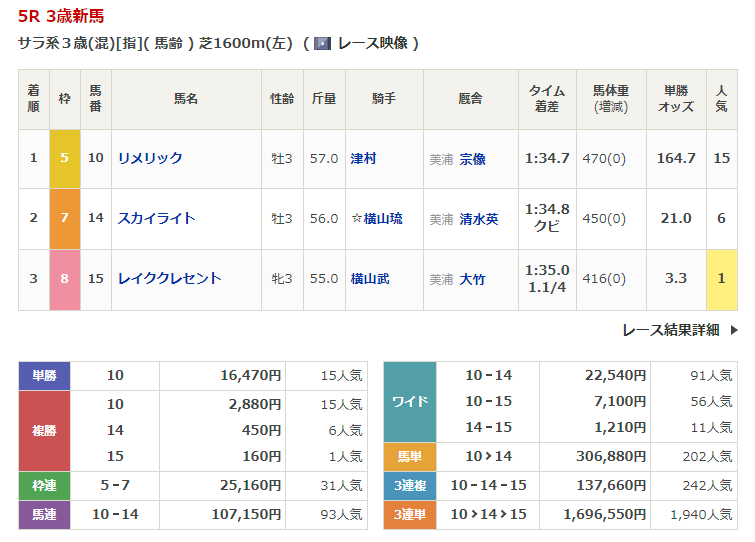 ◎ルクスメテオール(1人気)1着 単勝390円、複勝200円 - 1/14【小倉5R】3歳新馬