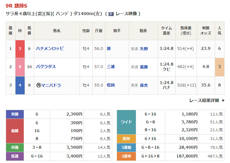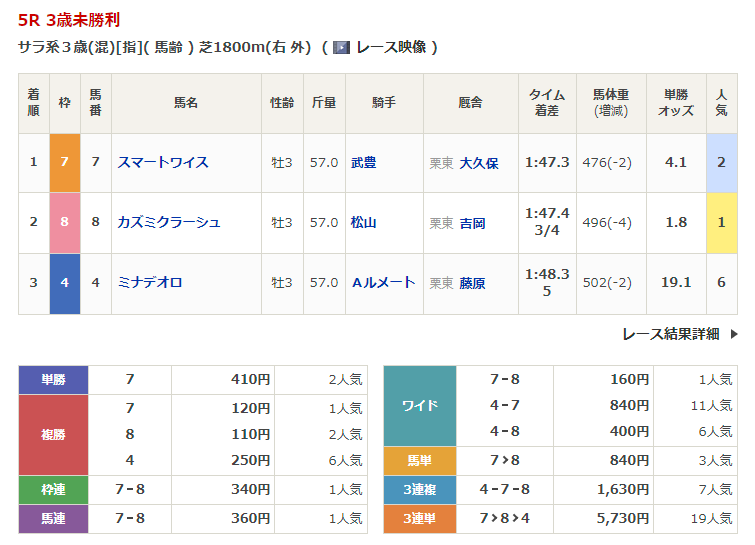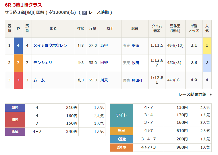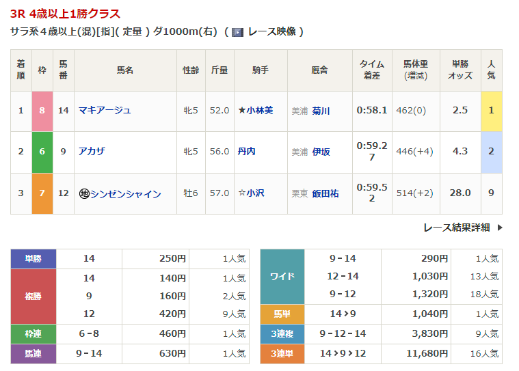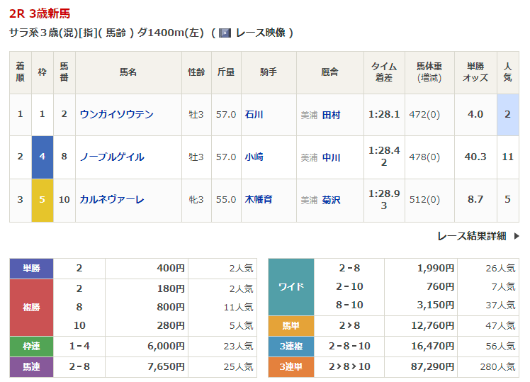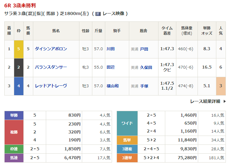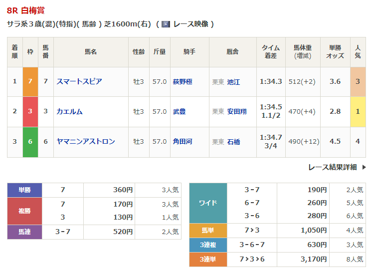 ◎ヴァレッタカズマ(6人気)3着 複勝340円