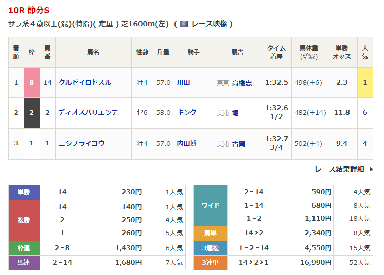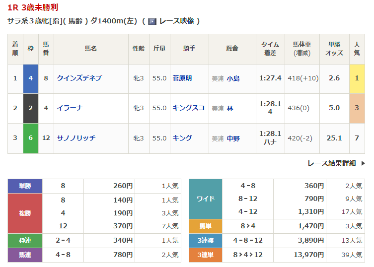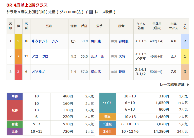◎キタサンドーシン(2人気)1着 単勝480円、複勝160円