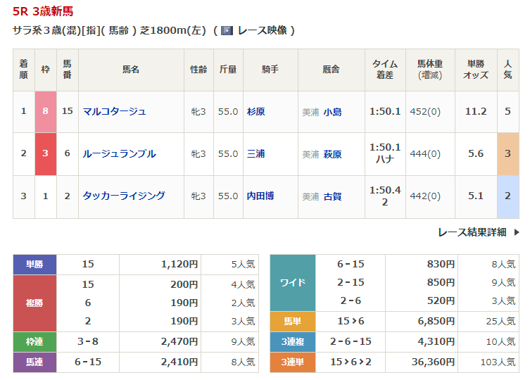 ◎マルコタージュ(5人気)1着 単勝1,120円、複勝200円