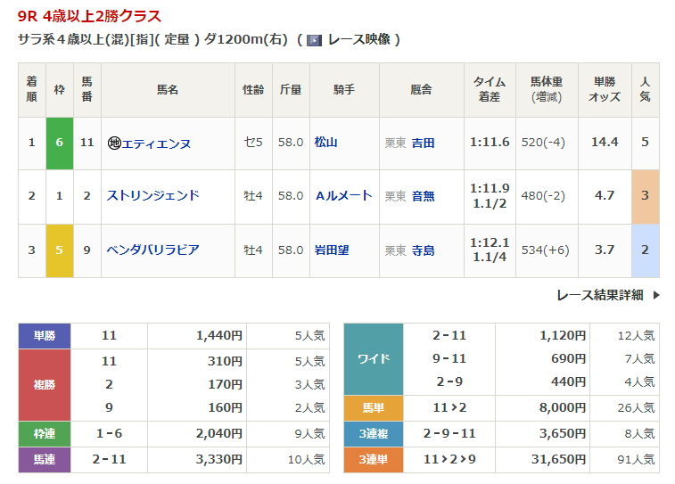 ◎エティエンヌ(5人気)1着 単勝1,440円、複勝310円