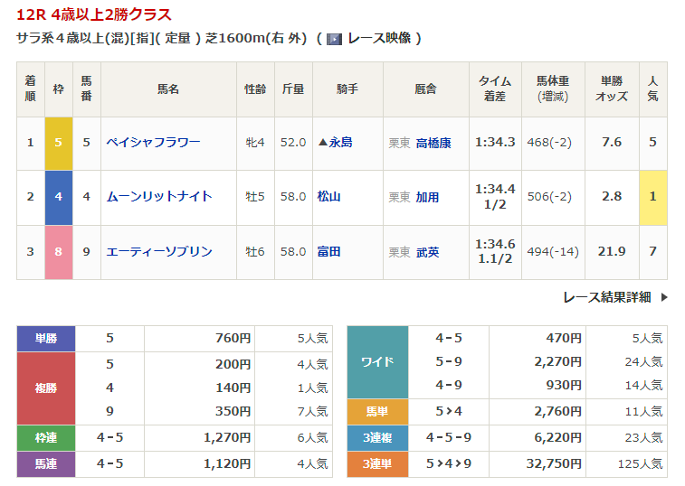 ◎ペイシャフラワー(5人気)1着 単勝760円、複勝200円