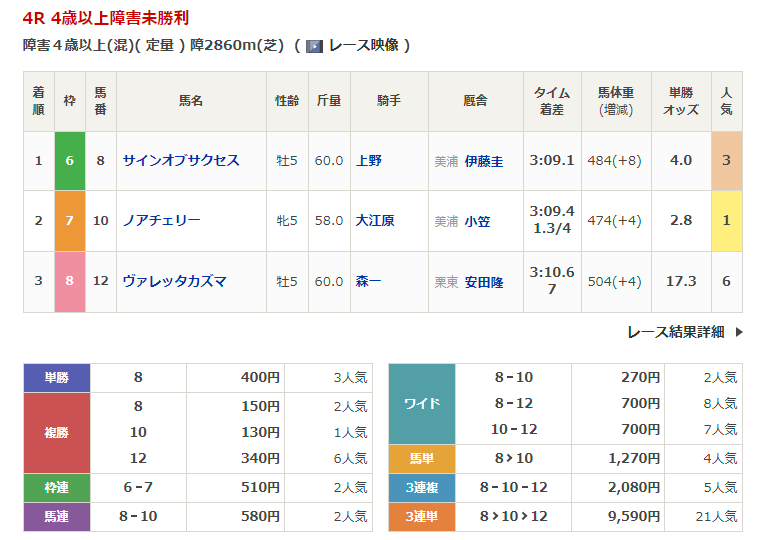 ◎ロードトレゾール(5人気)1着 単勝1,070円、複勝370円 - 1/20【小倉4R】4歳以上障害未勝利