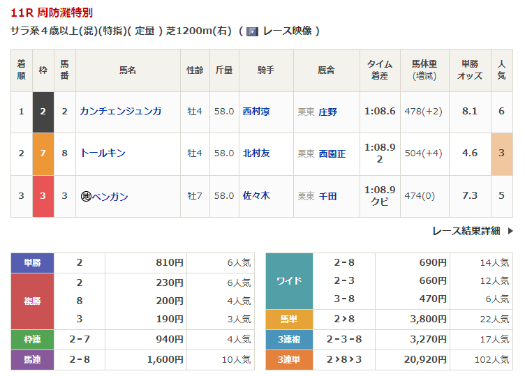 ◎カンチェンジュンガ(6人気)1着 単勝810円、複勝230円