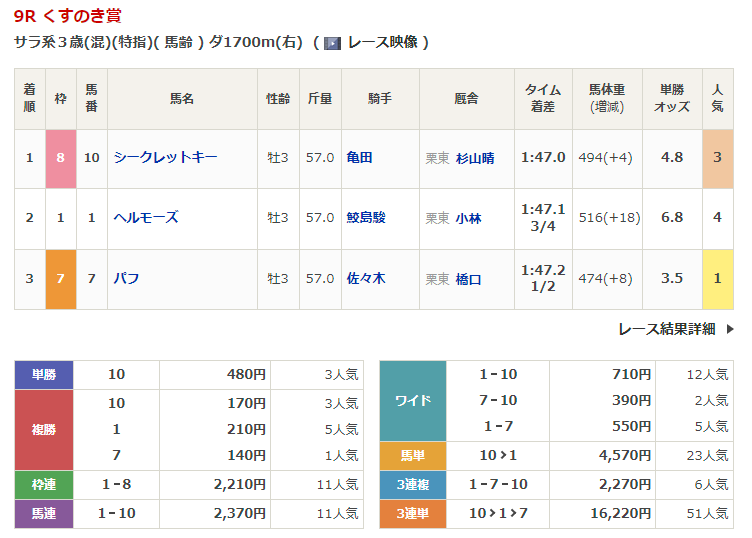 ◎シークレットキー(3人気)1着 単勝480円、複勝170円