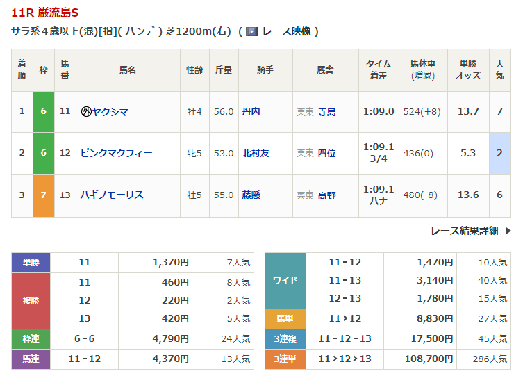 ◎ヤクシマ(7人気)1着 単勝1,370円、複勝460円