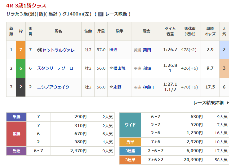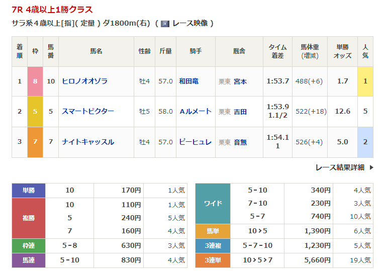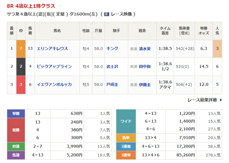 ◎エリンアキレウス(3人気)1着 単勝630円、複勝240円