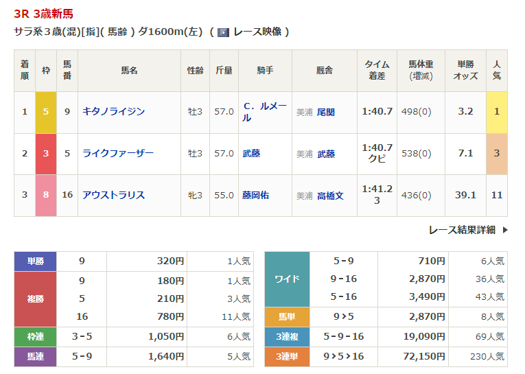 ◎アウストラリス(11人気)3着 複勝780円 - 2/4【東京5R】3歳新馬