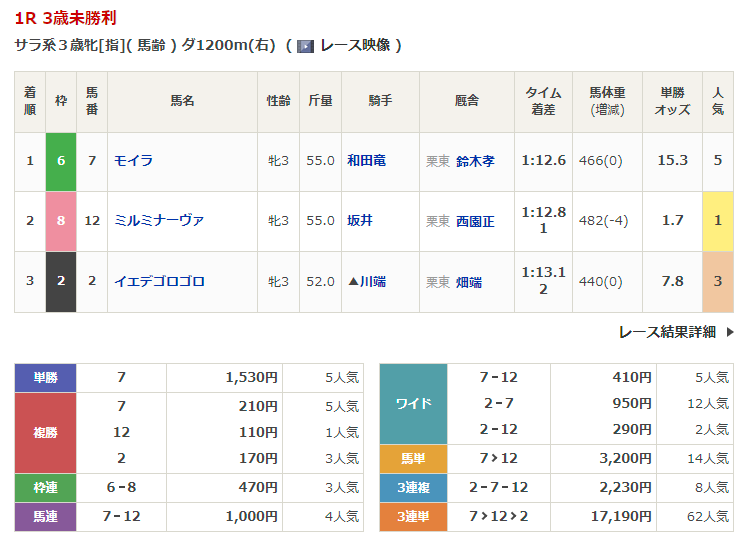 ◎モイラ(5人気)1着 単勝1,530円、複勝210円