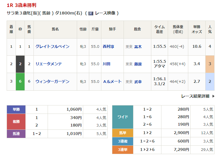 ◎グレイトフルペイン(4人気)1着 単勝1,060円、複勝340円